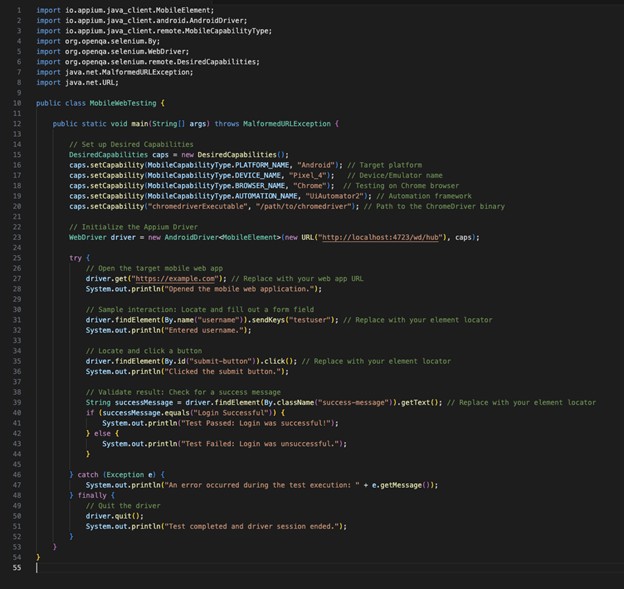 The above test script is primarily focused on running the testing process on Android devices. In case you want to use it for iOS, you simply have to replace the “platformName” and “browserName” with “iOS” and “Safari”, respectively.